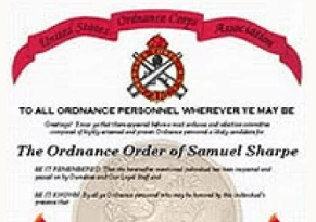 The Ordnance Order of Samuel Sharpe award is a display of recognition to select personnel who have demonstrated the highest standards of integrity and moral character, displayed an outstanding professional competence, served the Army Ordnance Corps with selflessness, and contributed to the promotion of the Ordnance Corps in ways that stand out to the recipient’s seniors, subordinates, and peers.